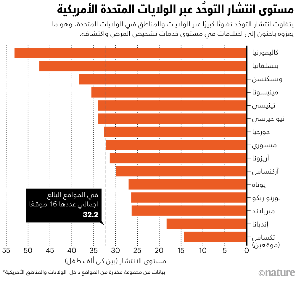 الإحصاءات التي أوردها كينيدي — والتي تشير إلى وجود حالة إصابة بالمرض بين كل 31 طفلًا في عمر ثمان سنوات — تأتي من تقرير أصدرته في إبريل الماضي «شبكة مراقبة التوحُد والاضطرابات النمائية» Autism and Developmental Disabilities Monitoring Network3، وهي برنامج رصدي يُحصي عدد حالات الإصابة بالتوحُد بين الأطفال من خلال تقارير الهيئات التعليمية والصحية (انظر الشكل "مستوى انتشار التوحُد عبر الولايات المتحدة الأمريكية). وتدلنا هذه التقارير على من تلقوا تشخيصًا بالمرض، وعلى المؤهلين للحصول على التعليم الخاص بالمصابين بالتوحُد. وأحيانًا ما يُشار إلى نتائج هذا النوع من الدراسات بمصطلح "نسب الانتشار السجلاتية" أو نسب الانتشار "الإدارية"، لأنها قائمة على قواعد بيانات إدارية.