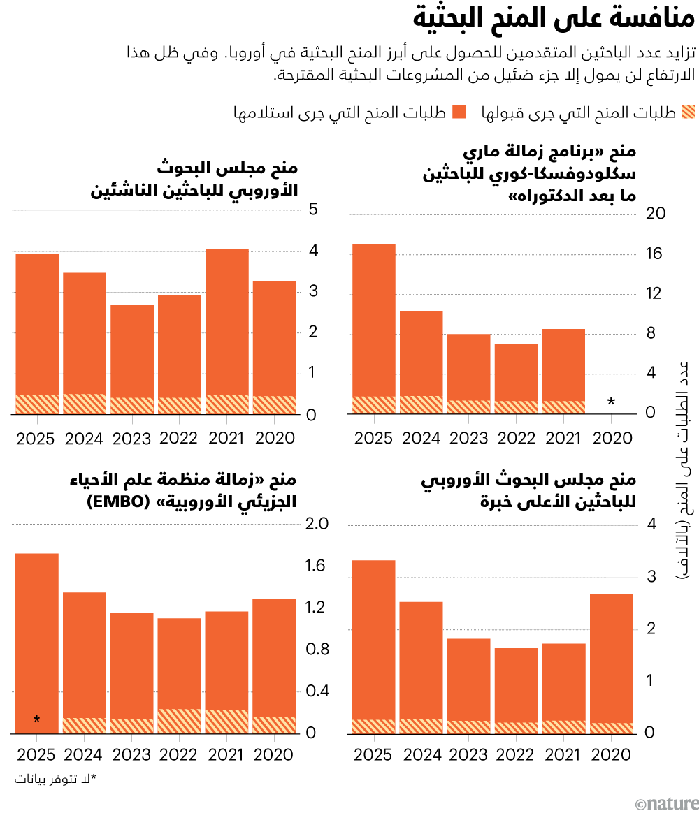 كذلك أفاد مجلس البحوث الأوروبي، وهو الهيئة الأوروبية الأبرز في تمويل البحوث الأساسية، بارتفاعات مماثلة في عدد طلبات المنح البحثية المقدمة إلى جميع برامجه. فحتى الآن، تلقى المجلس لمنحه المقدمة ضمن فئة «منح الباحثين الناشئين» نسبة أعلى بـ13% من المقترحات البحثية مقارنة بعام 2024 (وهي منح للباحثين الذين يتراوح عدد سنوات خبرتهم ما بين عامين إلى سبع سنوات بعد الحصول على درجة الدكتوراة). وانخفضت نسبة ما سوف يُمول من المشروعات البحثية ضمن هذه الفئة من المنح إلى 12% مقارنة بـ14% العام الماضي.